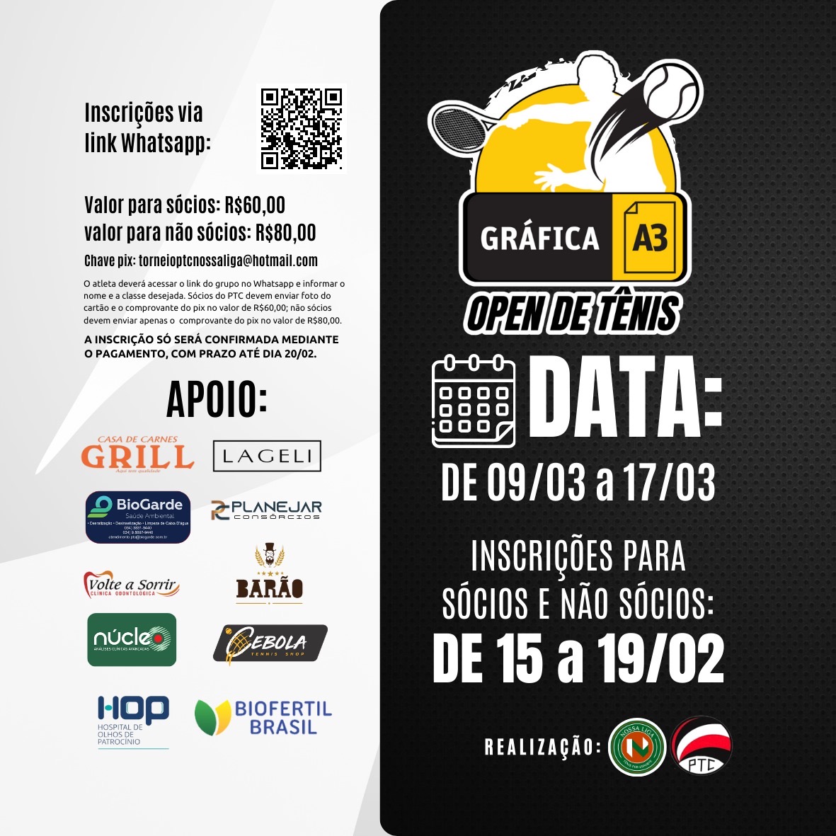 Acontecerá o torneio ‘’Gráfica A3 Open de Tênis’’, no Patrocínio Tênis Clube (PTC) de 09 a 17 de março realizado pela ‘‘A Nossa Liga’’ e pelo PTC. Este evento promete ser uma experiência esportiva emocionante e repleta de competições de alto nível.