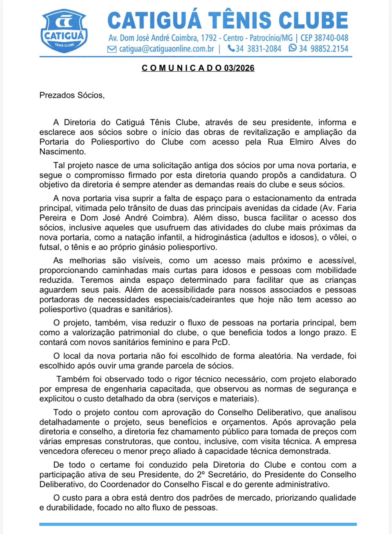 A diretoria do Catiguá Tênis Clube divulgou um comunicado oficial na data de ontem, 30 de março de 2026, informando sobre o início das obras de revitalização e ampliação da Portaria do Poliesportivo do Clube. A nova entrada, que terá acesso pela Rua Elmiro Alves do Nascimento, foi projetada para atender uma demanda antiga dos sócios e reflete o compromisso da diretoria com as necessidades do clube.