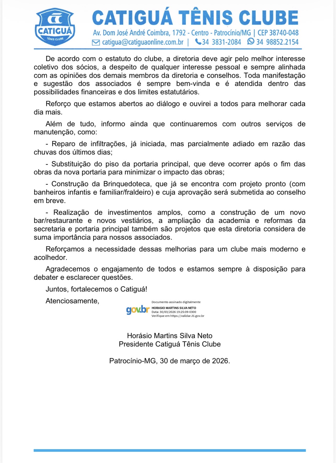 Reforçamos a necessidade dessas melhorias para um clube mais moderno e acolhedor. Agradecemos o engajamento de todos e estamos sempre à disposição para debater e esclarecer questões. Juntos, fortalecemos o Catiguá!