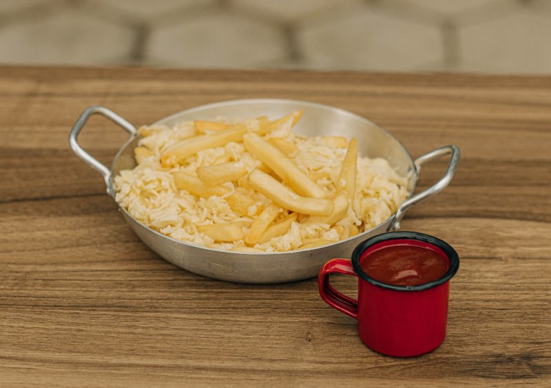 frita sublime: Porção de batata frita crocante, coberta com queijo minas e