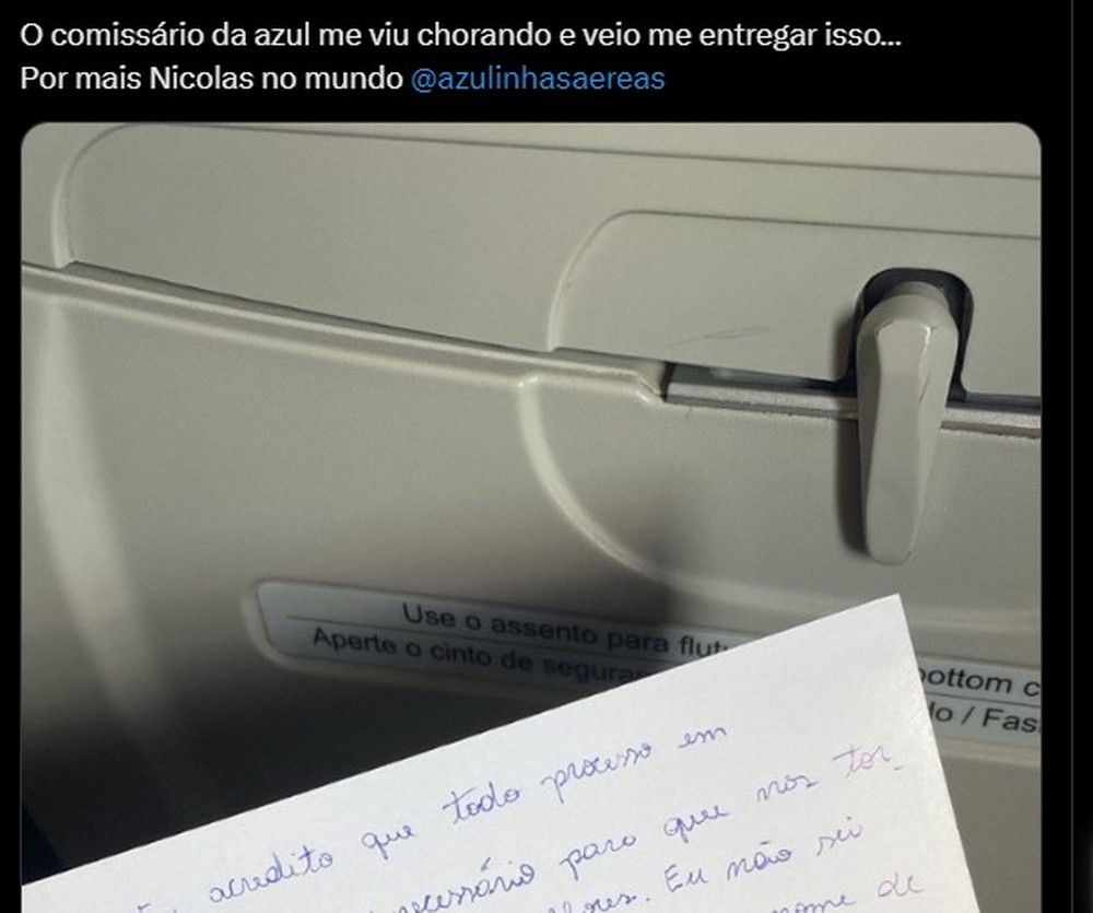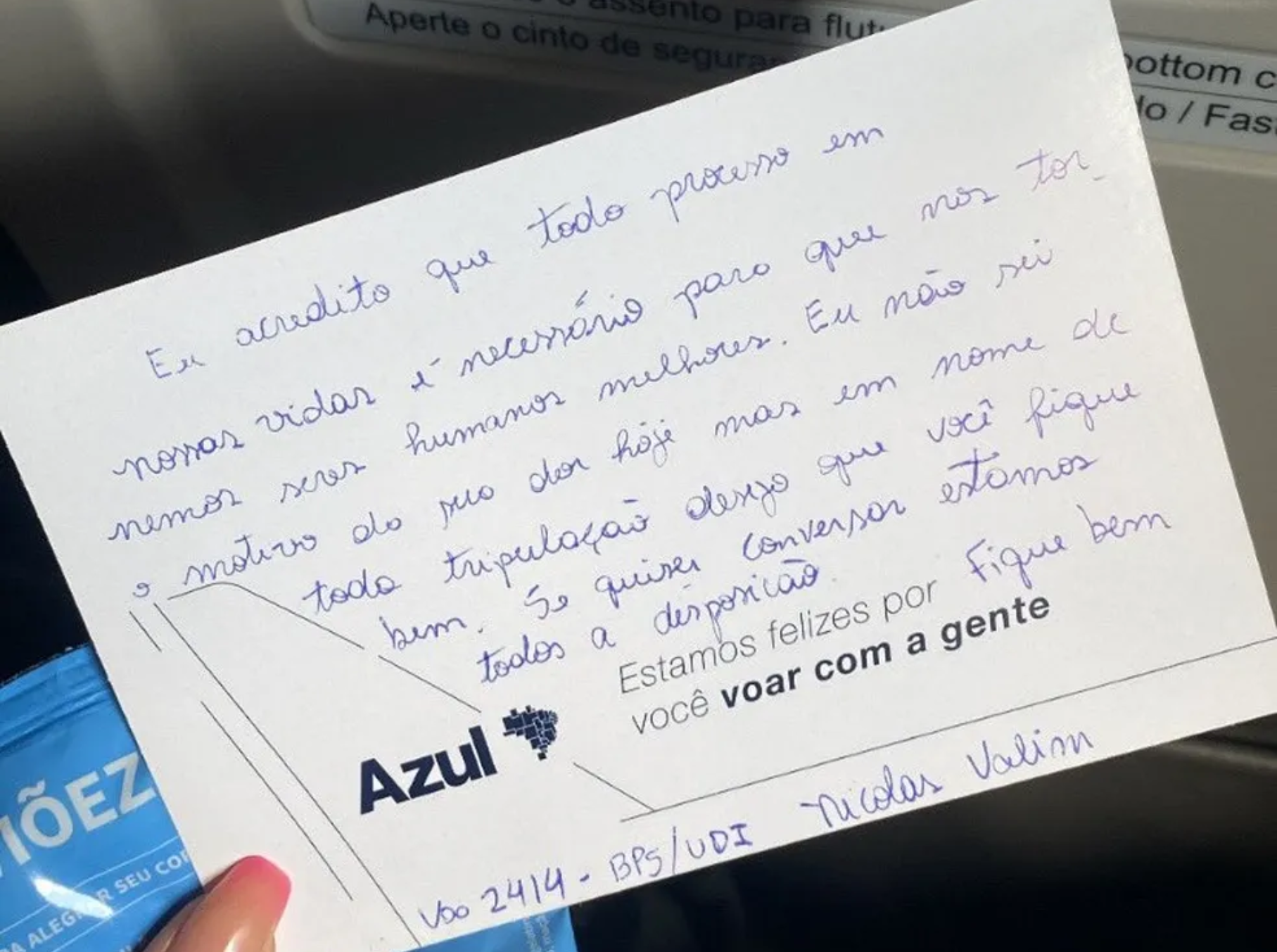 Abalada pela notícia, Andressa chorava durante o voo quando foi surpreendida por um bilhete carinhoso entregue por um dos comissários da equipe da companhia aérea Azul. O bilhete, assinado por Nicolas Valim, continha uma mensagem reconfortante e solidária:
