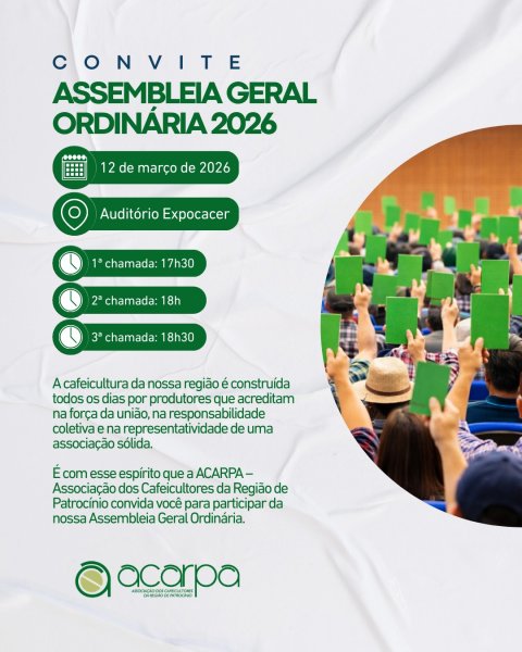 A ACARPA – Associação dos Cafeicultores da Região de Patrocínio realizará no dia 12 de março de 2026 a sua Assembleia Geral Ordinária (AGO), reunindo produtores associados para um momento de prestação de contas, alinhamento institucional e fortalecimento da representatividade da cafeicultura regional.