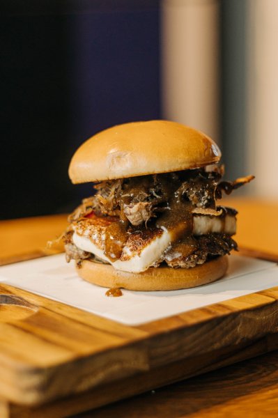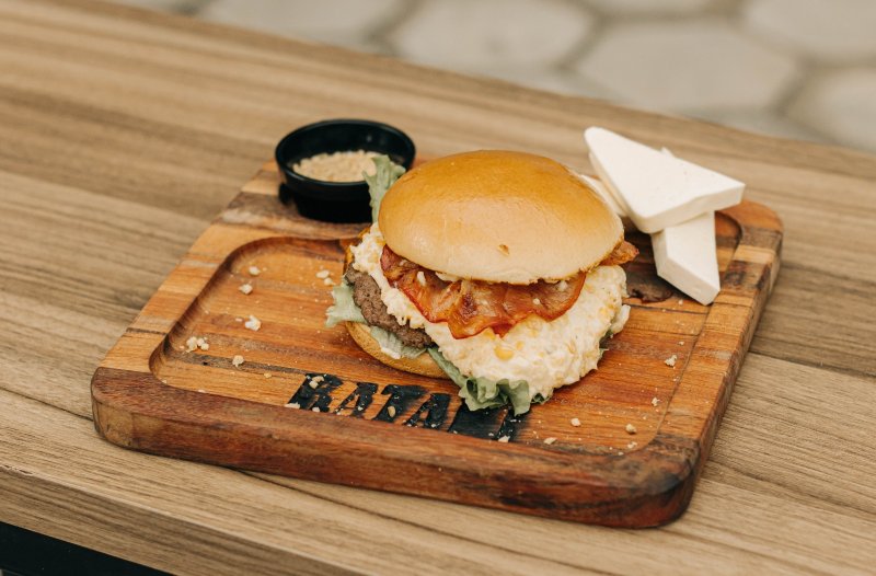 barbecue, queijo minas puxa puxa, chutney de abacaxi e couve crocante. |